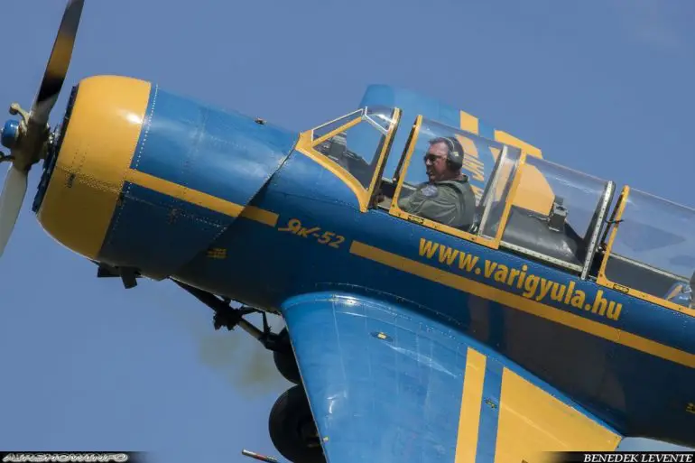 • Vári Gyula műrepülő pilóta bemutatója JAK-52 típusú repülőgépével